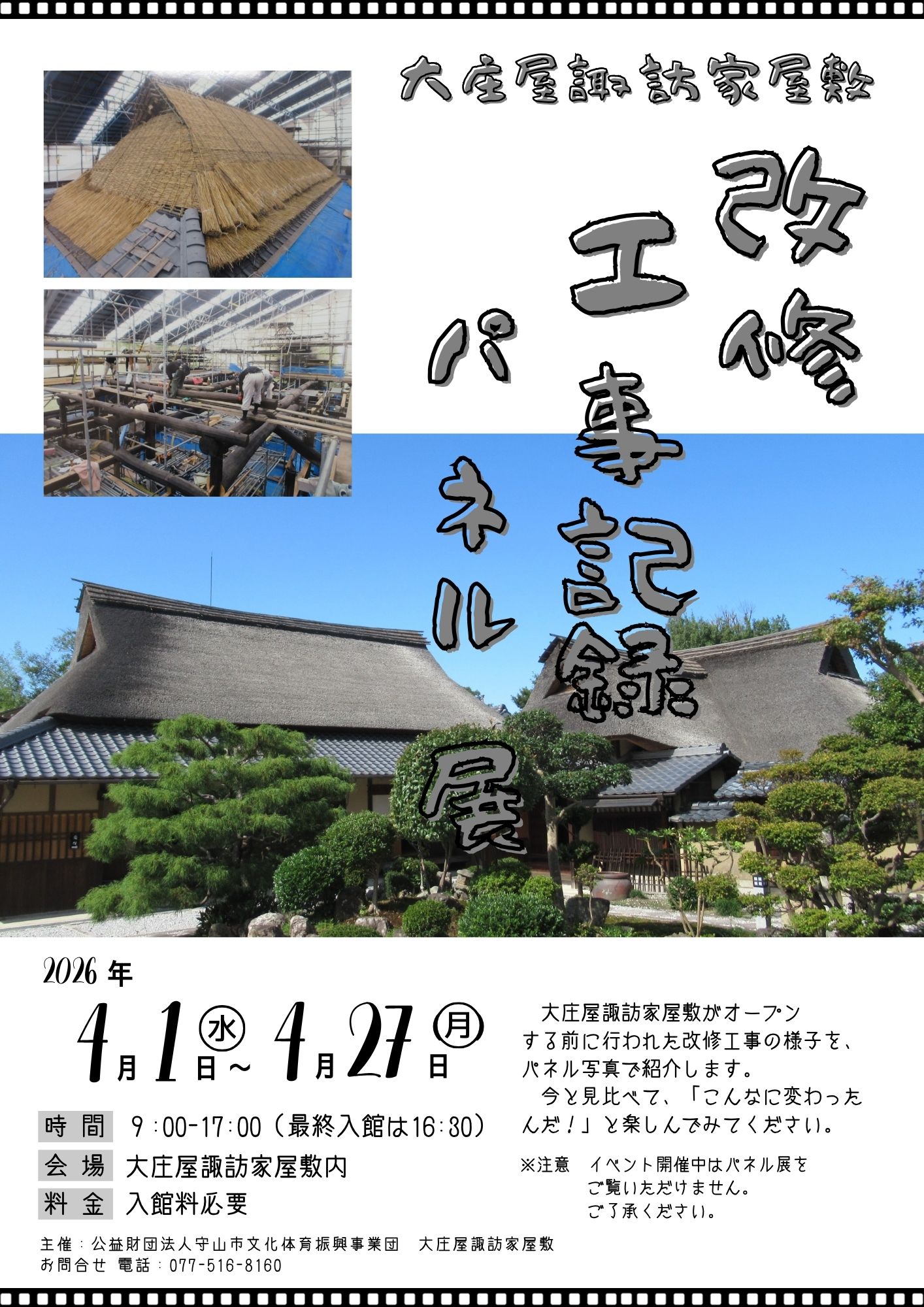 大庄屋諏訪家屋敷がオープンする前に行われた改修工事の様子を、主屋、書院、茶室にてパネル写真で紹介します。今と見比べて「こんなに変わったんだ」と楽しんでみてください。