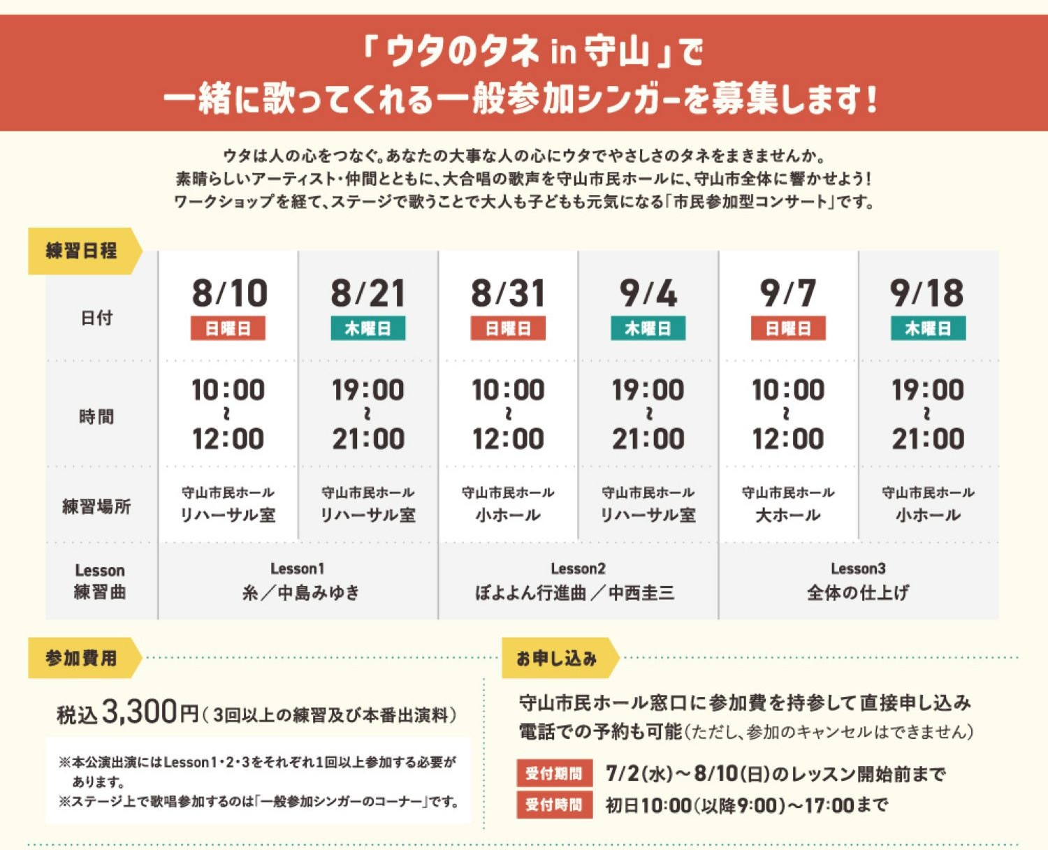 「ウタのタネin守山」で一緒に歌ってくれる一般参加シンガーを大募集中‼