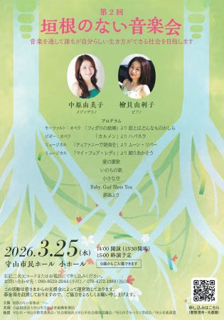 第2回 垣根のない音楽会 【出演】 中原由美子(メゾソプラノ) 檜貝由利子(ピアノ) 【会場】 守山市民ホール・小ホール 【時間】 13:30開場、14:00開演、15:00終演予定 【入場料】 要整理券・先着順(0歳か ...