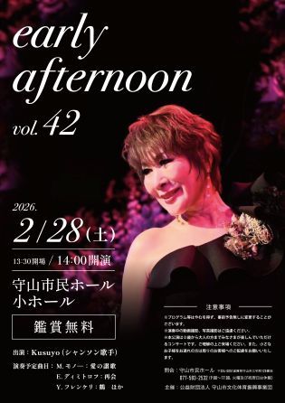 early afternoon vol.042 【出演】 Kusuyo(シャンソン歌手) 【会場】 守山市民ホール・小ホール 【時間】 13:30開場、14:00開演 【入場料】 鑑賞無料 【予定プログラム】 M.モノ― ...